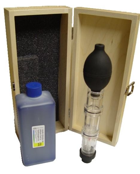 Lieferung in Holzkassette mit ausführlicher Anleitung und 500ml Indikatorflüssigkeit. Ersatzflüssigkeit kann bei uns jederzeit nachbestellt werden.
